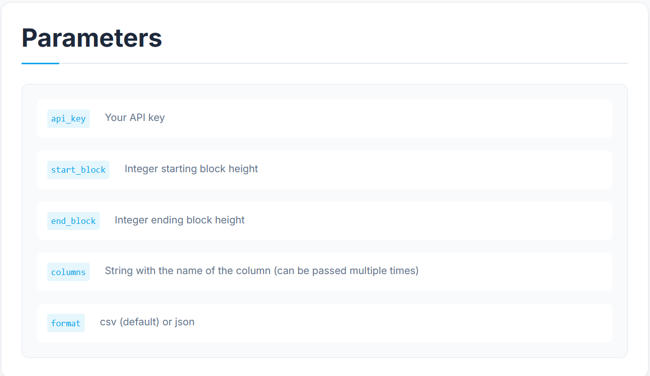 Finally, our API is fully functional, allowing you to specify block heights and choose which columns to retrieve—whether all or just a selection.